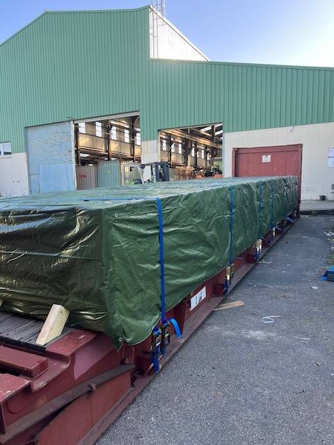 Le bâchage des caisses a été réalisé à l’aide de bâches faites sur mesure en polyéthylène haute densité permettant de garantir une protection perméable grâce à une résistance de 240g/m2.